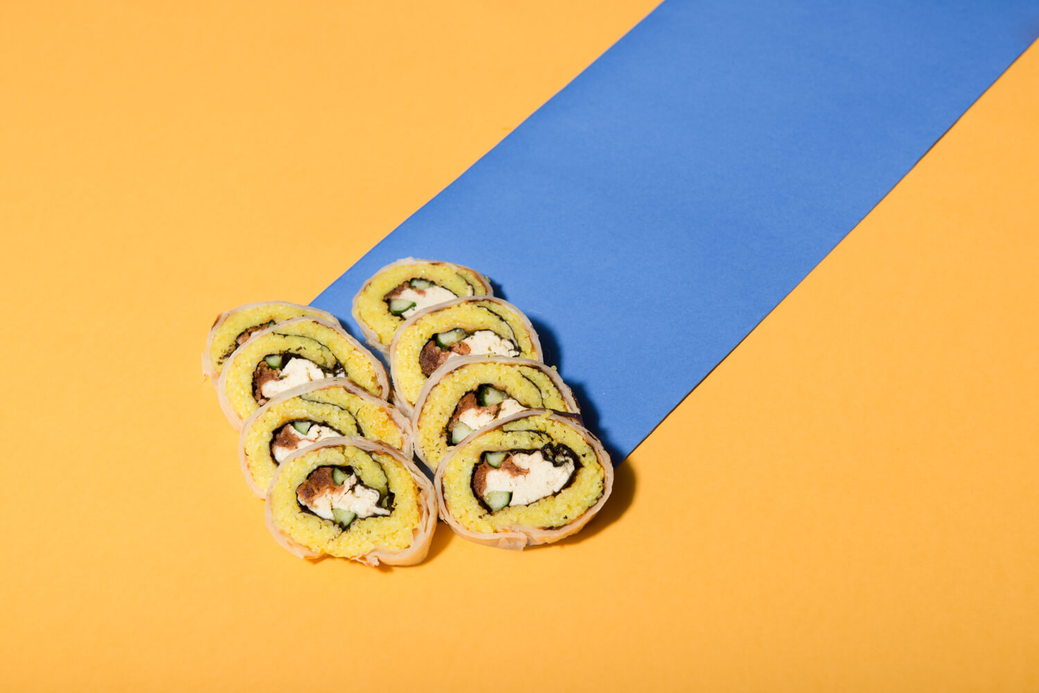 米洗好,加入水及鬱金香粉、油,下去蒸好之後,趁熱加入壽司醋及糖攪拌放置一旁,準備壽司捲簾,先餔一層保鮮膜,將飯放置中心網正方形鋪開,可灑一點海苔粉,放上海苔片後封保鮮膜將壽司捲簾移開置一旁,將壽司翻面,保鮮膜第一層拉開後,在中心偏下放置肉鬆、小黃瓜,煎好蛋皮在食材上方淋上美奶滋後,開始做滾壽司的動作,第一下需握緊食材,再一次性的滾過去,將左右綁好保鮮膜放置一旁後將餅皮煎上色,取出壽司的保鮮膜後裹上去即可。